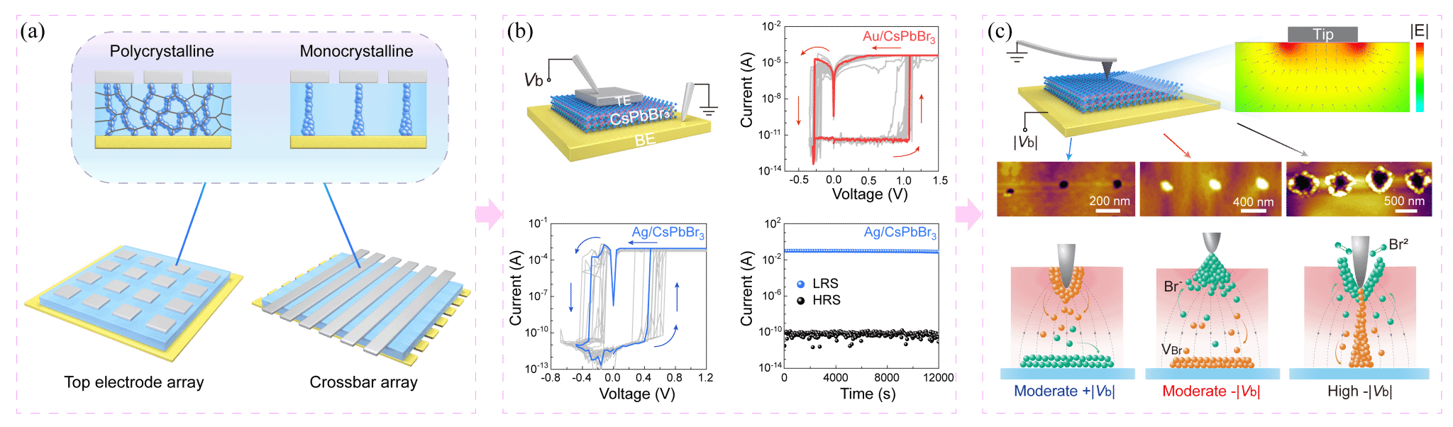 卤素钙钛矿作为一种新兴的半导体材料,其独特的软晶格结构、高迁移性的离子和优异的光电特性在感存算一体、神经形态计算及可穿戴柔性忆阻器等领域具有良好的应用前景。在忆阻器阵列中,缩小单个器件的关键尺寸对于提高器件封装密度、降低功耗和提升计算性能至关重要。本研究报道了团队在钙钛矿忆阻器在尺寸微缩过程中发现的独特离子集效应(Ion crowding effect)。杨一鸣教授介绍,该效应类比于双极型晶体管中的电流集边效应(Current crowding effect),源于器件关键尺寸缩减至亚微米以下时,在电极-材料界面附近显著增强的边缘电场。该局域化的强电场驱动了材料中离子的定向迁移与重新分布,成为决定器件阻变性能的关键因素。团队通过仿真计算与实验测试分析,在多尺度下(3 mm30 nm)验证了离子集边效应,并制备了可控性较高的器件阵列。该项研究不仅将现有钙钛矿忆阻器的尺寸缩减了两个数量级以上,同时阐明了微尺度下软晶格体系中离子运动的一般规律,为器件的进一步微型化与集成奠定了基础。