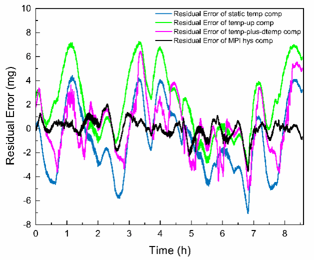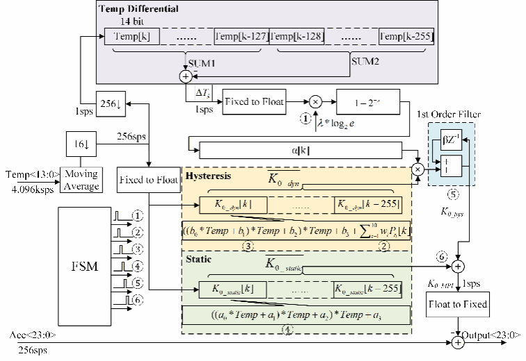 本研究基于时分复用(TDM)技术,设计了一种三轴加速度计读出专用集成电路(ASIC)。首次将改进型Prandtl–Ishlinskii(MPI)模型引入到MEMS加速度计的温度补偿中,实现了在不同温度变化速率下,对MEMS加速度计零偏温度滞回的高精度补偿。试验表明,该方案在−5 °C~55 °C范围内实现了36 dB的零偏温漂抑制比。该方案兼容性强,同时克服了传统多项式补偿方法的局限性,具备工业生产的应用潜力。
