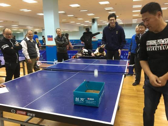 首先进行的是发球入筐比赛活动,规则是把一个纸箱放在对面的半区,参赛人发球过网,球落在纸箱里得1分,玩起来不大好得分,规定每人发六个球,得分多者获胜。最后男子组刘勐、杨一鸣、骆英民分获前三名,女子组付东娟、金秀梅、张贺秋并列前三名。