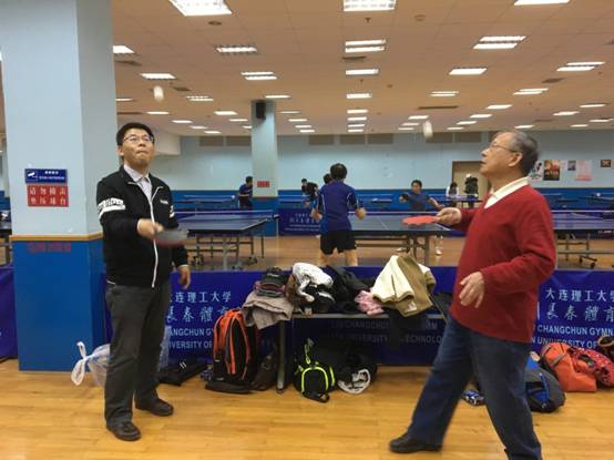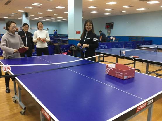 紧接着进行了颠球比赛,规则用乒乓球拍颠球,要求颠球过头顶,计时1分钟,颠球次数多者为胜。最后决出男子组前三名的是杨一鸣、郭吉洪、梁红伟与申人升并列第三,女子组前三名的是王晨、金秀梅、马艳华。