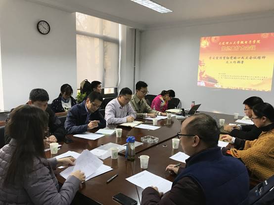 此次会议的主要内容是付冬娟书记传达学习宣传贯彻党的十九大精神工作要求,要扎实推动党的十九大精神学习研究宣传全覆盖,自觉用习近平新时代中国特色社会主义思想武装广大干部师生头脑。李一鸣副书记做学院学习贯彻党的十九大精神工作部署,要迅速兴起学习宣传贯彻党的十九大精神的热潮,积极营造学起来、教起来、传起来、研起来、干起来、实起来的良好氛围。