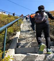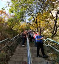 登山的路上风景如画,山石奇峻,因正值晚秋,树木五彩斑斓。尽管山路又长又陡,我们仍然坚持不懈,忍着肌肉的酸痛一步步拾级而上。