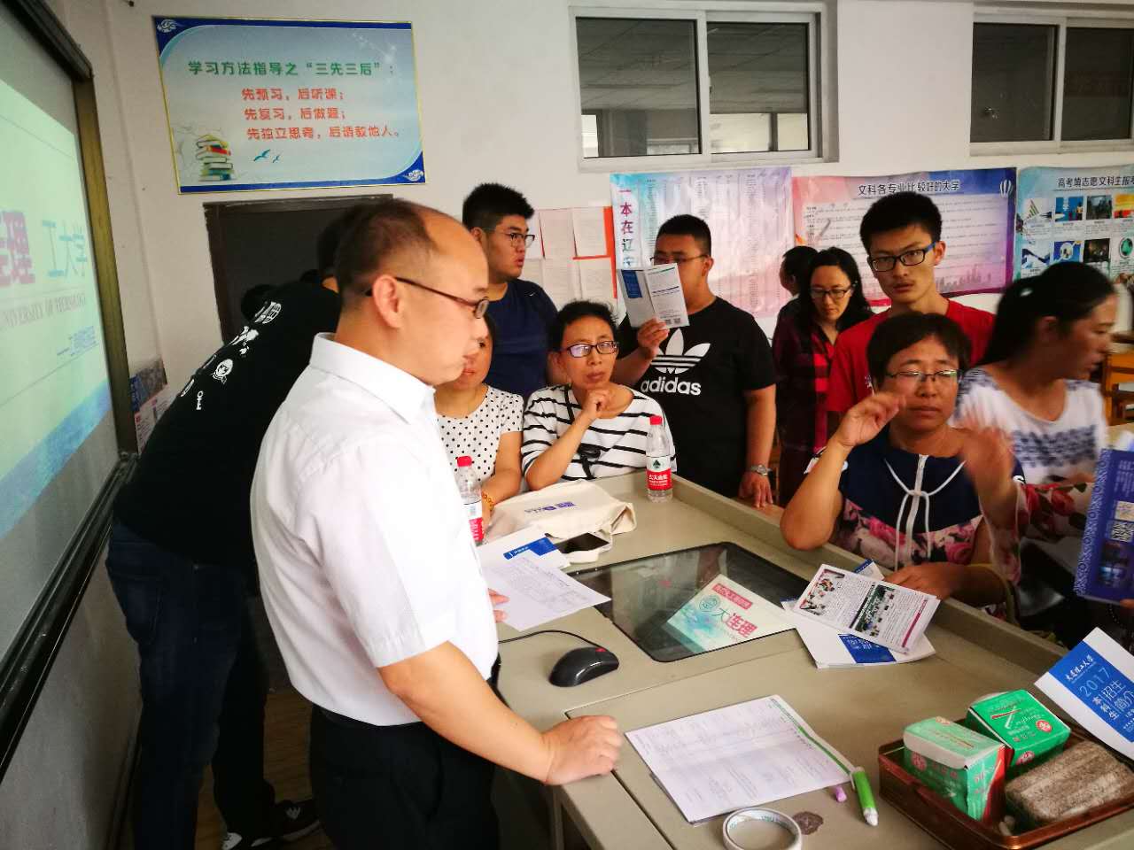 鞍山地区7所中学专场高招咨询会集中安排在2天之内,海城高中、台安高中、岫岩高中等县级中学远离鞍山市区,交通不便。工作组合理制定了鞍山地区2017年高招咨询任务表,2个工作日内参加了全部8场高中专场咨询会,发放宣传材料2340份,张贴宣传海报20张,接待考生及家长千余次咨询。为了增强招生宣传效果,工作组建立了“大工鞍山高招咨询考生家长交流群”,及时解答家长咨询,将学校最新招生情况在群里做宣传推广。