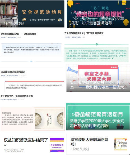 安全规范教育活动月宣传活动联合微电子学院团委宣传部,制定系列主题【安全规范教育活动月】,发布总计10余篇专题推送,涵盖思想教育、习惯养成、规则学习等多方面的安全防护知识。通过推送的形式,让大家多留心,多注意,促进大家了解日常生活中的安全。强化大家安全意识,培养我们的安全规范行为习惯,改正不良习惯,防患于未然。