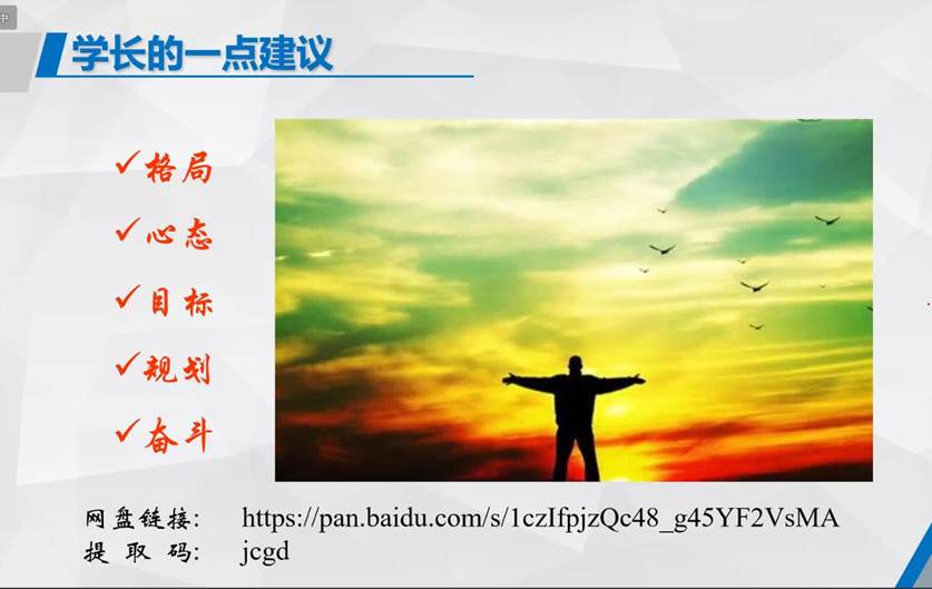 讲座的最后刘斌教授以学长的口吻用自己的亲身经历给母校的学生们提出了自己对待人生的几点建议:格局、心态、目标、规划以及奋斗,并简单讲述了以上几点建议的重要性,引起了学生们的广泛共鸣。