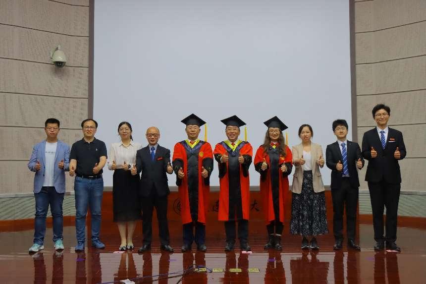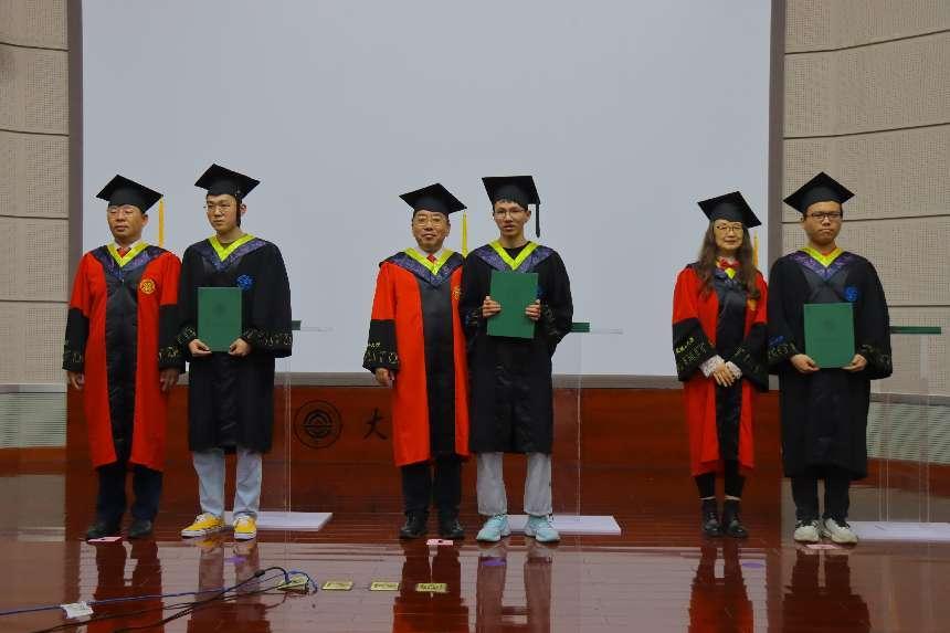 伴随着院歌《芯光》的悠扬旋律,与会人员回到典礼会场。在全场肃穆的国歌中毕业典礼正式开始。毕业生学位授予仪式上,罗钟铉、梁红伟、付冬娟三位导师组成的导师团,为每一名毕业生拨穗、颁发学位证书,留下最美的合影。