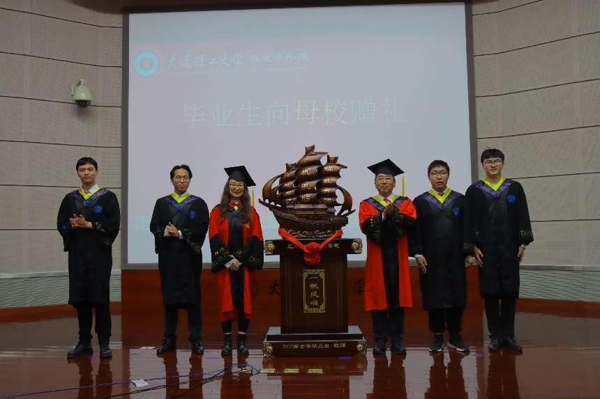 毕业生代表向学院赠送礼物,木制的“一帆风顺”寄予了全体毕业生最美好祝福,潮平岸阔,风正帆悬,祝愿微电子学院蒸蒸日上,赓续辉煌,再谱华章!谷彦姝同学代表线上参会的毕业生发言,感谢学院策划云端毕业典礼,让不能返校的学生参会,为大学四年画上圆满的句号。线下毕业生代表王嘉伟同学,感谢全体老师在生活、学术、工作中无微不至的关怀和照顾,号召全体毕业生不忘大工求学时光,不负过往,不惧未来。扎实专业知识,为国家行业发展贡献力量。