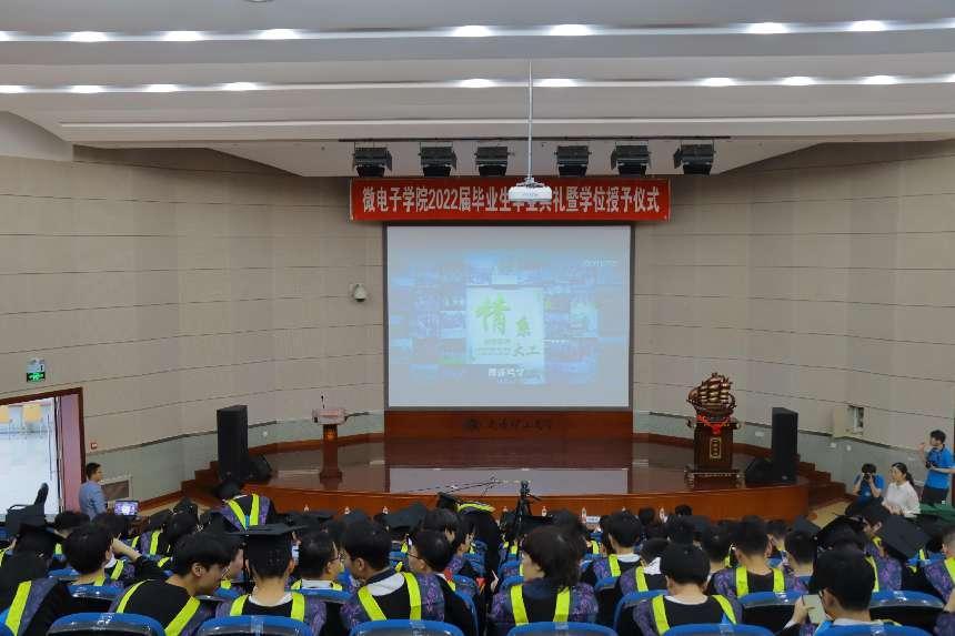 大黑山下花香馥郁,思源涌泉桃李芬芳。2022年6月13日晚6时,微电子学院2022届毕业典礼暨学位授予仪式在我校开发区校区图书馆报告厅举行,校党委常委、副校长,校区党工委书记、管委会主任,微电子学院首任院长罗钟铉,微电子学院党委书记付冬娟,党委副书记副院长李一鸣,学院副院长梁红伟,以及住校教师代表、学生工作办公室全体辅导员与学院本科毕业生共同出席典礼。同时,因疫情不能返校的毕业生与家长,在线上参与了典礼。