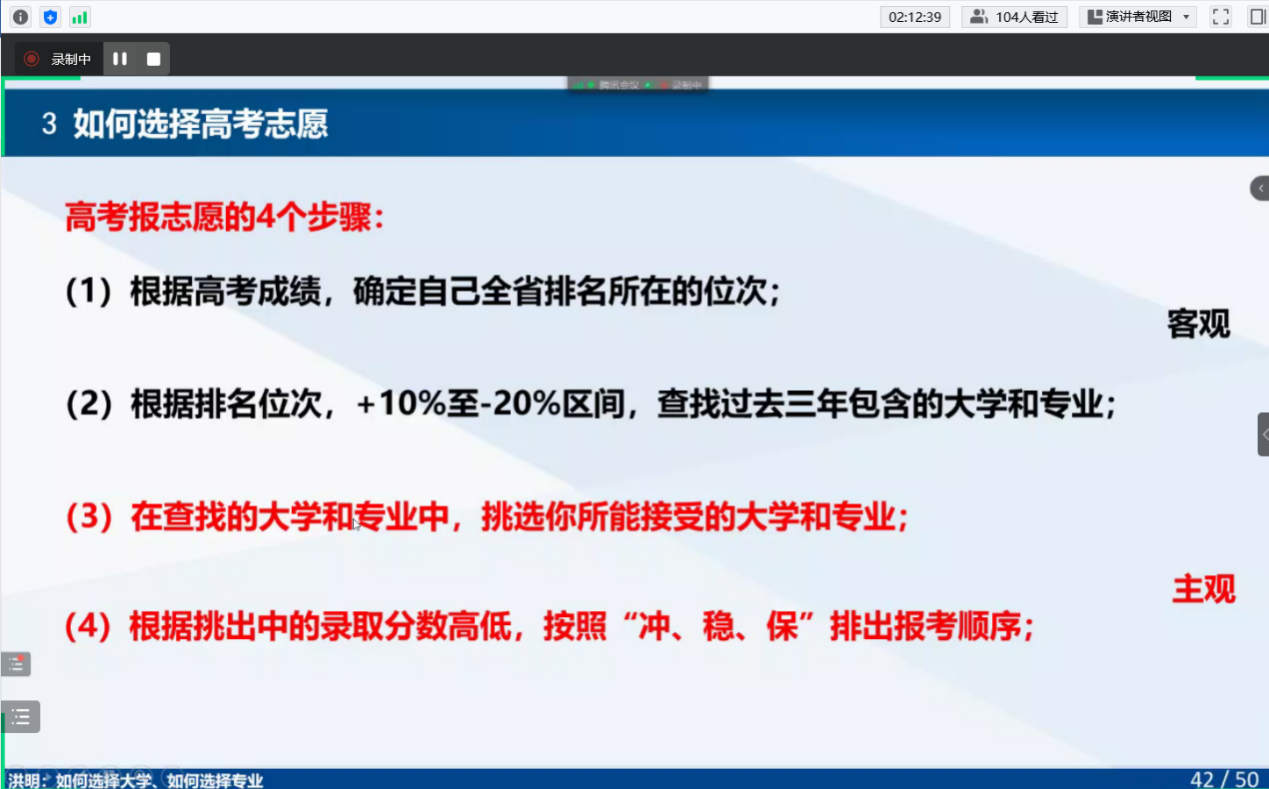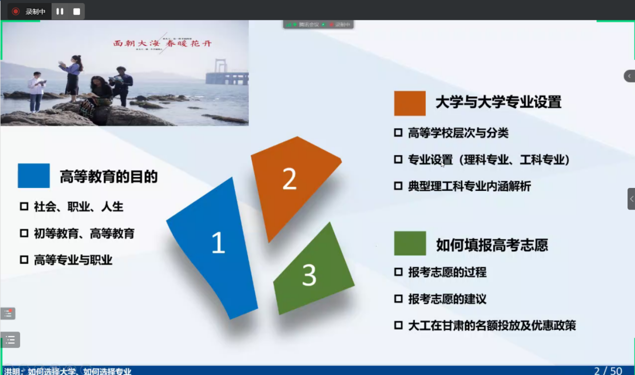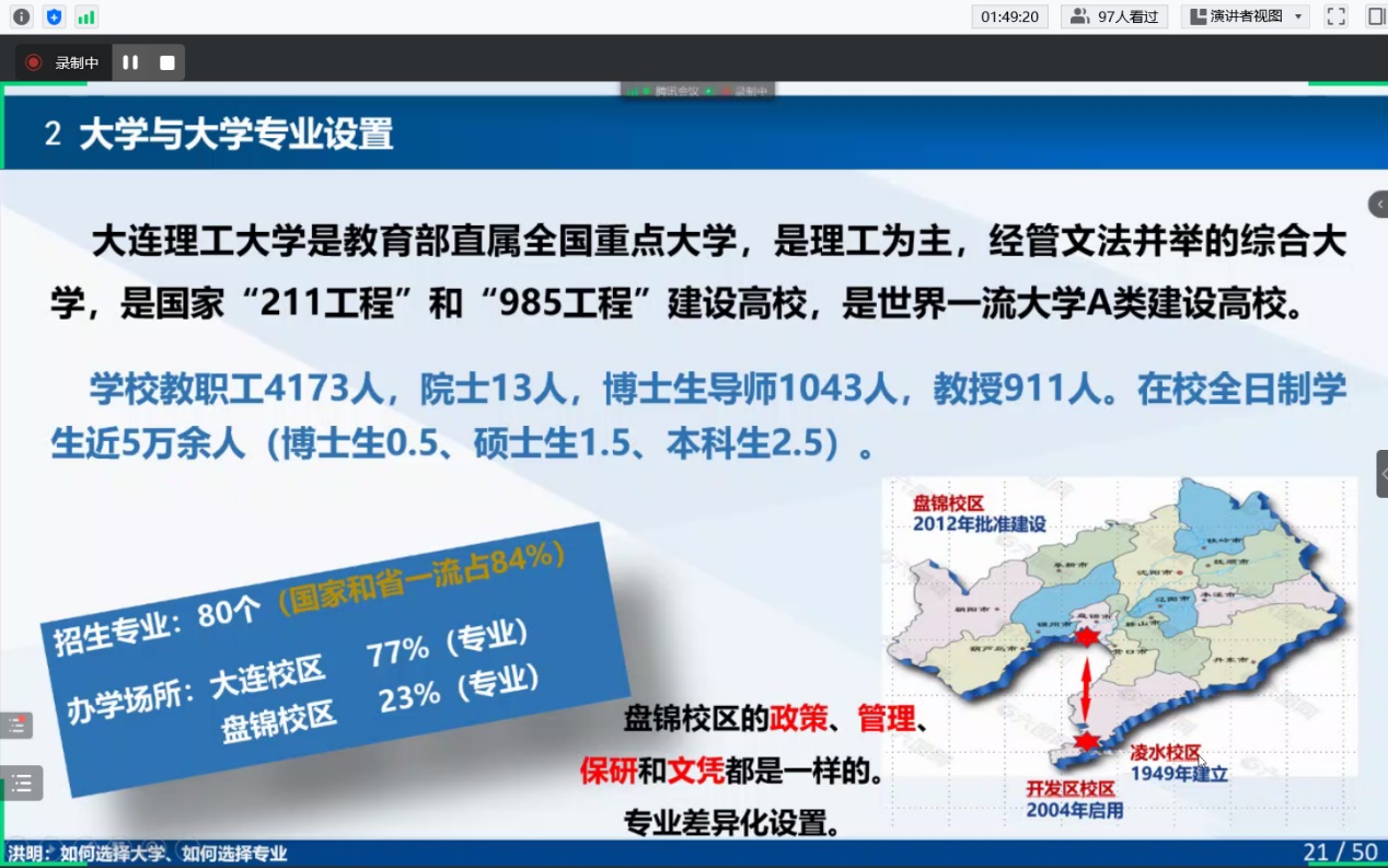 第三部分洪教授结合自己的经验总结出填报志愿的四条建议,帮助家长更早、更有目的、更为系统的结合生涯规划帮助孩子提前筛选锁定学校及专业,有的放矢!之后洪教授解读了大工在甘肃的招生政策,助力家长以及孩子更好的了解大连理工。最后,洪明教授就家长和学生的一些提问进行解答,对他们不了解的地方做了进一步解读。