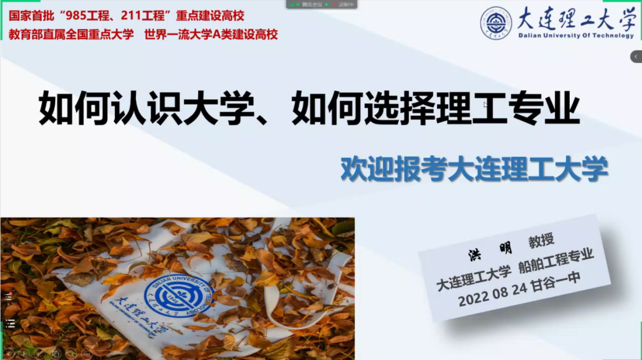 为进一步提高我校本科生生源质量,扩大我校在甘肃地区招生宣传影响力,微电子学院继续在疫情防控常态化形势下优化招生宣传策略。8月24日,大连理工大学船舶工程学院教授、国家自然基金面上项目评审专家、教育部和辽宁省本科教学审核评估专家洪明老师以线上方式为甘肃省甘谷一中开展大工讲堂,深层次、多维度的让学生及家长了解如何选择大学,如何选择理工科专业。