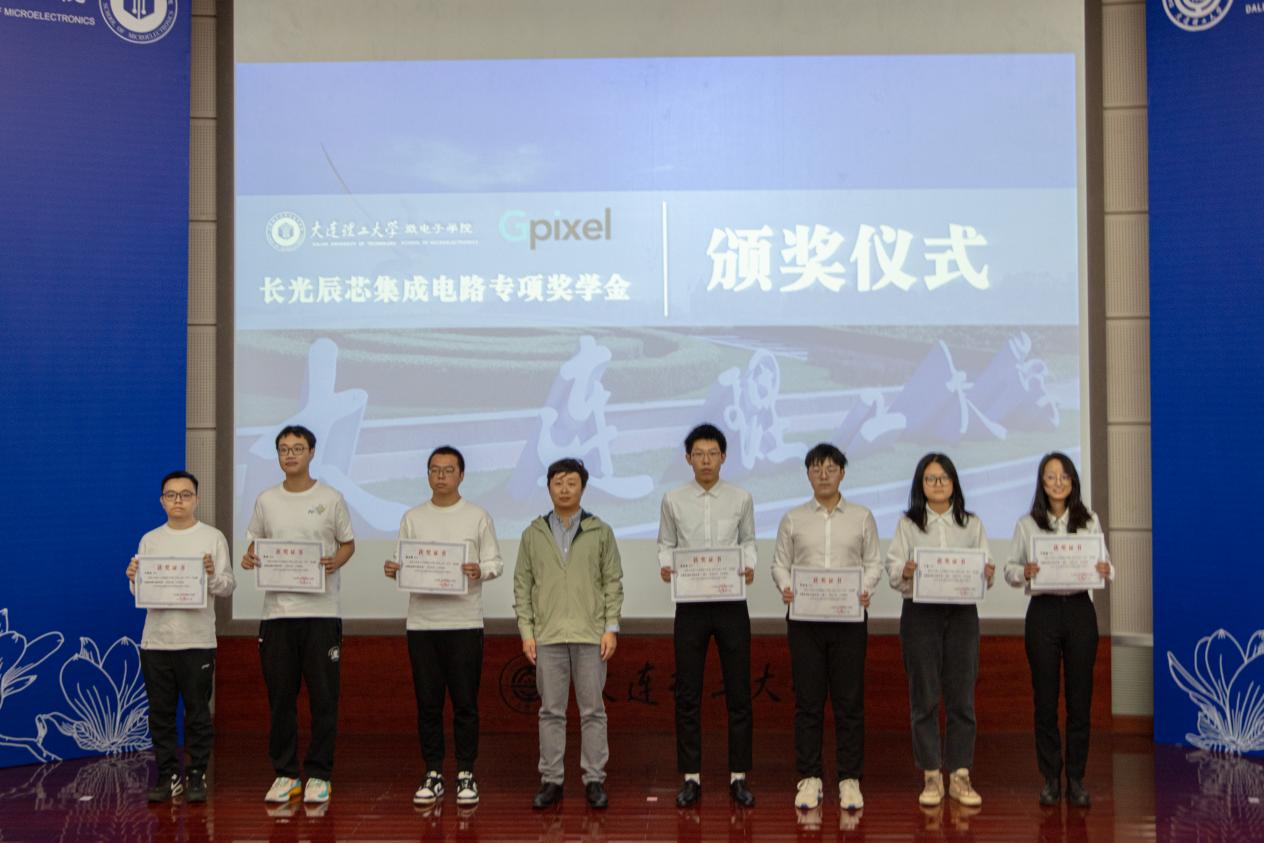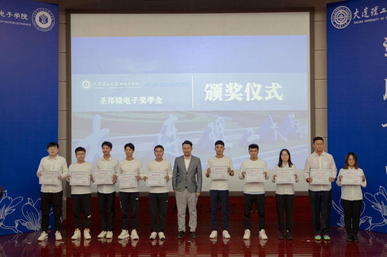 典礼第六项,学院首批专项奖学金颁奖仪式。设奖单位代表为我院学子颁发证书并亲切合影。随后大连长光辰芯微电子有限公司总经理刘洋致辞,对我院人才培养做出了很高的评价,并且希望更多人可以投身半导体事业;大连圣邦骏盈微电子有限公司总经理李精文致辞,分析了微电子行情,同时李经理作为校友也表达了对学院的感激和想要长期合作进行人才培养的期望。