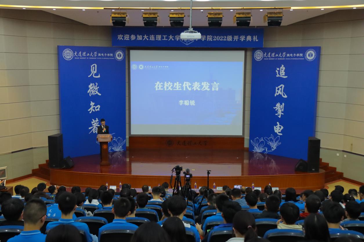 为了帮助新生尽快适应大学生活,加强对新生的入学教育和引导,大连理工大学微电子学院于2022年10月10日晚上18:30在开发区校区图书馆报告厅举办了以“芯之所向,新芯向荣”为主题的2022级新生开学典礼。出席本次典礼的嘉宾有大连长光辰芯微电子有限公司总经理刘洋、办公室主任尹慧,大连圣邦骏盈微电子有限公司总经理李精文、办公室主任朱晓敏,微电子学院党委书记付冬娟,教授、博士生导师、副院长梁红伟,党委副书记、副院长李一鸣,教授、博士生导师、副院长、微2201班班主任常玉春,副院长、微2203班班主任申人升,副教授、党委委员张贺秋,副教授、微2204班班主任、博士生导师马艳华,高级工程师、微2205班班主任刘勐,工程师骆英民,学院综合办公室和学生工作办公室的所有老师,还有学生代表以及线上观礼的各位同学、家长。本次典礼由微电子学院学生工作办公室主任王娣老师主持。
