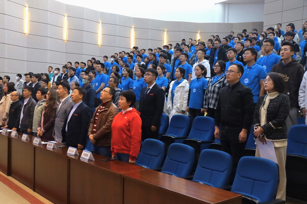 典礼开始,全体师生起立奏唱国歌,神情肃穆。