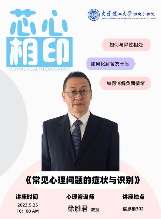 为了加强心理委员在大学生心理健康建设中的作用,增强朋辈辅导的意识与能力,在同学有心理问题时做到及时的发现与积极介入,帮助同学及时解决心理问题,促进身心健康发展,微电子学院综合事务中心面向各级队和各班级的心理委员,成功组织举办了“芯心相印“心理专题培训讲座。本次讲座邀请大连理工大学开发区校区心理咨询分中心心理咨询师徐胜君老师开展主题为常见心理问题的症状与识别的讲座。