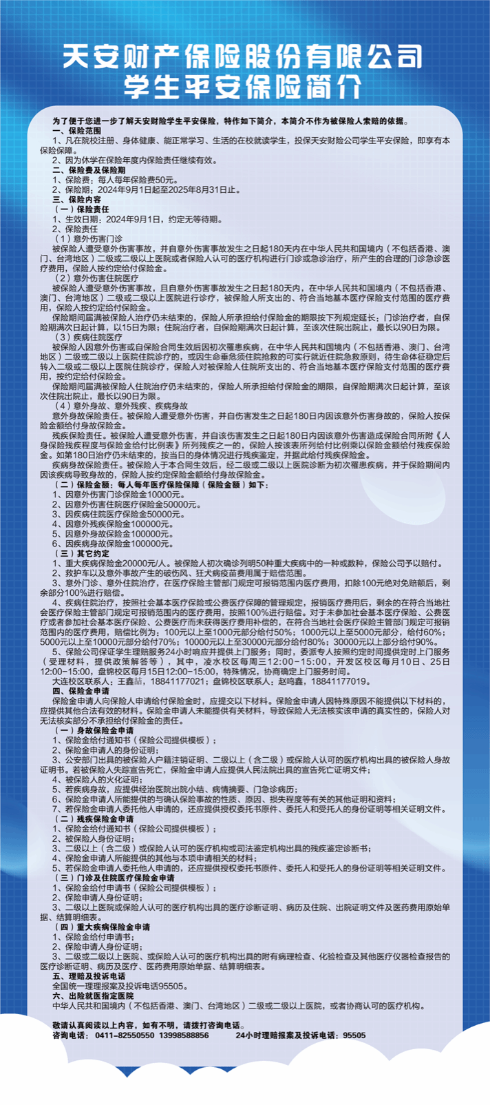 2024–2025学年我校商业补充保险缴费标准为50元/学年,投保时间为即日起至2024年8月31日,保障期为2024年9月1日–2025年8月31日,服务单位为天安财产保险股份有限公司大连分公司。2024–2025学年未在保的本科生及研究生,可通过微信/支付宝扫码,自助完成商业补充保险投保缴费。保险简介如下: