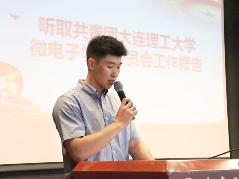 接下来,微电子学院团委书记岳俊帆老师代表学院团委向大会作工作报告。报告回顾了共青团大连理工大学微电子学院委员会过去的工作,分析了当前面临的新形势、新任务,报告中指出,在过去的一年里,在学校团委的指导下,在学院党总支的大力支持与帮助下,在学院团委全体学生干部的不懈努力与奋斗下,学院克服了时间紧,任务重,缺乏经验等一系列困难,认真高效地完成了组建团委、规范规章制度、形成积极氛围、培养优秀人才等一系列工作任务。报告中同时明确了未来工作的思路和目标,对未来工作进行展望:新学年,微电子学院团委将坚持以育人为中心,以活动为载体,以德育为先导,不断加强团的自身建设。以发挥团员学生的主体意识,调动团员学生的积极性,增加团组织的凝聚力,全面提高团员学生的综合素质为目标,统筹兼顾思想政治教育、基层组织建设、校园文化发展,深入贯彻落实党的十九大精神,加强学生思想引领,助力学生全面发展,大力推进从严治团,以奋斗的姿态迎接未来共青团工作,力争使学院共青团的工作迈上新台阶,为学校“双一流”建设贡献力量!