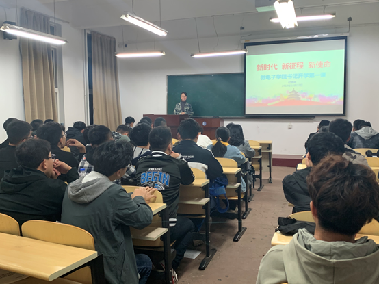 会上,付冬娟书记主讲了题为《新时代 新征程 新使命》的开学第一课。付书记分别从学校总体情况、学院的建设情况和未来的发展情况这几个方面进行了讲解,最后希望作为祖国未来的社会主义建设者、各条战线生力军的同学们,一定要牢记中国近现代史的历史及其基本经验,继承先辈的优良传统,“不忘初心、牢记使命”,在习近平新时代中国特色社会主义思想的指导下,自觉地承担起时代赋予同学们的历史使命,在实现中国梦的生动实践中放飞青春梦想。