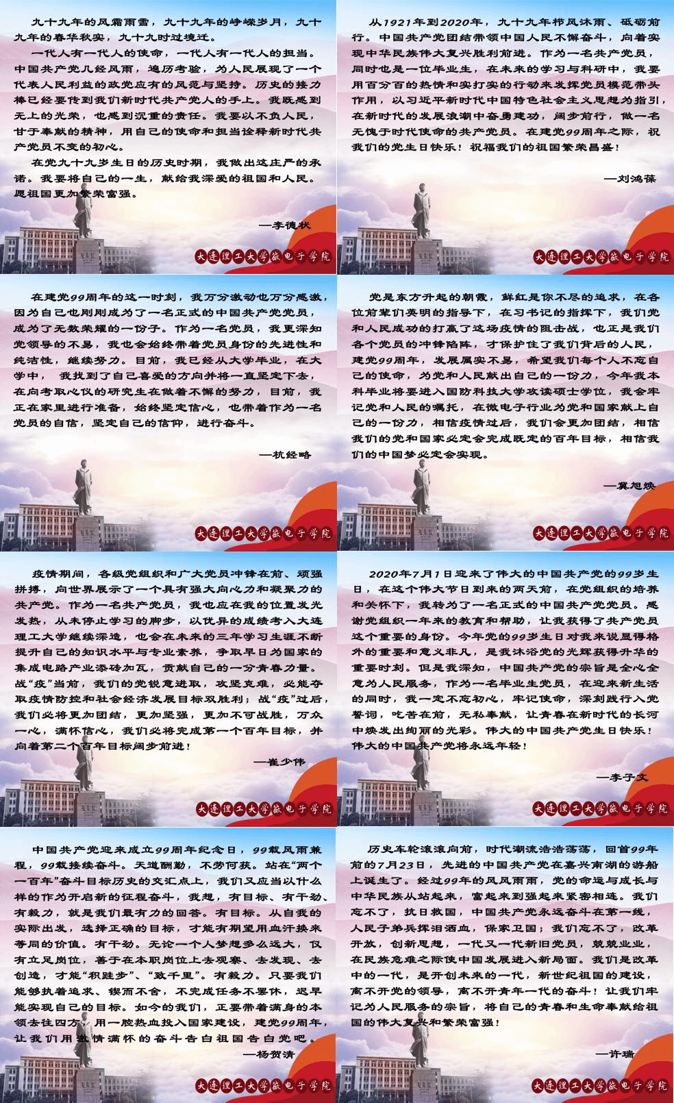 正如一些同学所说,在学习了党史、新中国史后,从我们党在领导革命、建设、改革的实践中,深刻理解了中国共产党何以成为中华民族的中流砥柱,深切感受到了党的伟大、光荣、正确,作为一名共产党员,感到十分的骄傲与自豪,同时也清醒地认识到了自己所肩负的使命与责任,在建党99周年之际,希望党越来越好,祖国越来越强,顺利实现两个100年奋斗目标,实现中华民族伟大复兴。