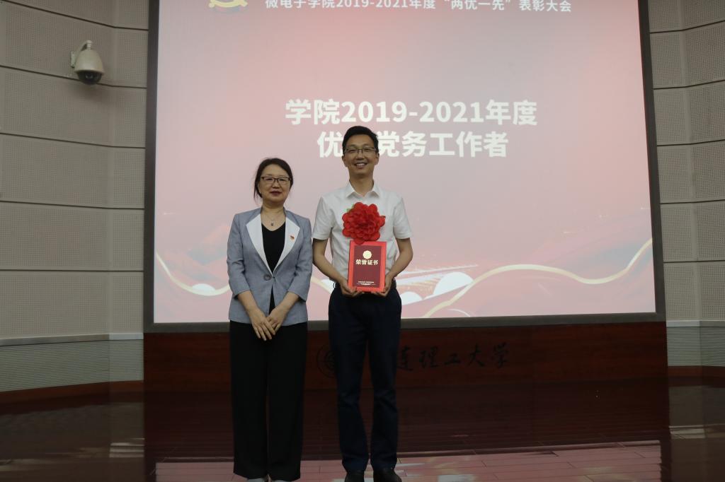 在庄严的国歌声中,大会正式开幕。李一鸣宣读《微电子学院党委关于表彰2019-2021年度先进基层党组织、优秀共产党员、优秀党务工作者的决定》,学院党委书记付冬娟上台依次为受表彰的先进集体和优秀个人颁发荣誉证书。